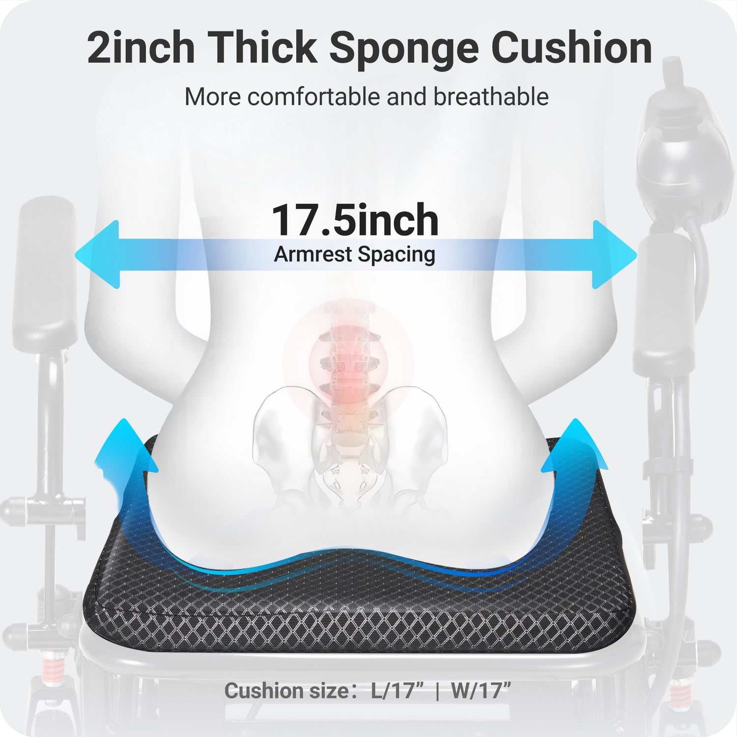 17.5" wide armrest spacing provides wider room for a more relaxed and comfortable ride. Paired with a 2-inch thick sponge cushion, it offers excellent support and improves comfort during extended useβwhether at home, outdoors, or while traveling.